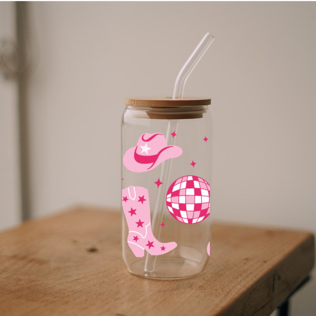 Saddle up, sparkle up, and sip in style! This pink disco cowgirl cup is for the girls who two-step straight from the dance floor to the coffee bar. Featuring boots, hats, and a disco ball that screams main character energy.