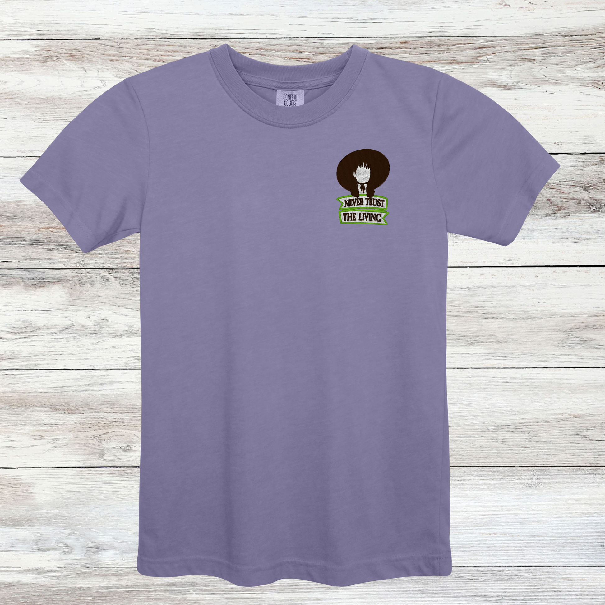 Step into the afterlife in style with our Never Trust the Living apparel. Inspired by spooky vibes and cult-classic nostalgia, this design features Lydia Deetz silhouette paired with the haunting reminder we all know too well: Never Trust the Living.