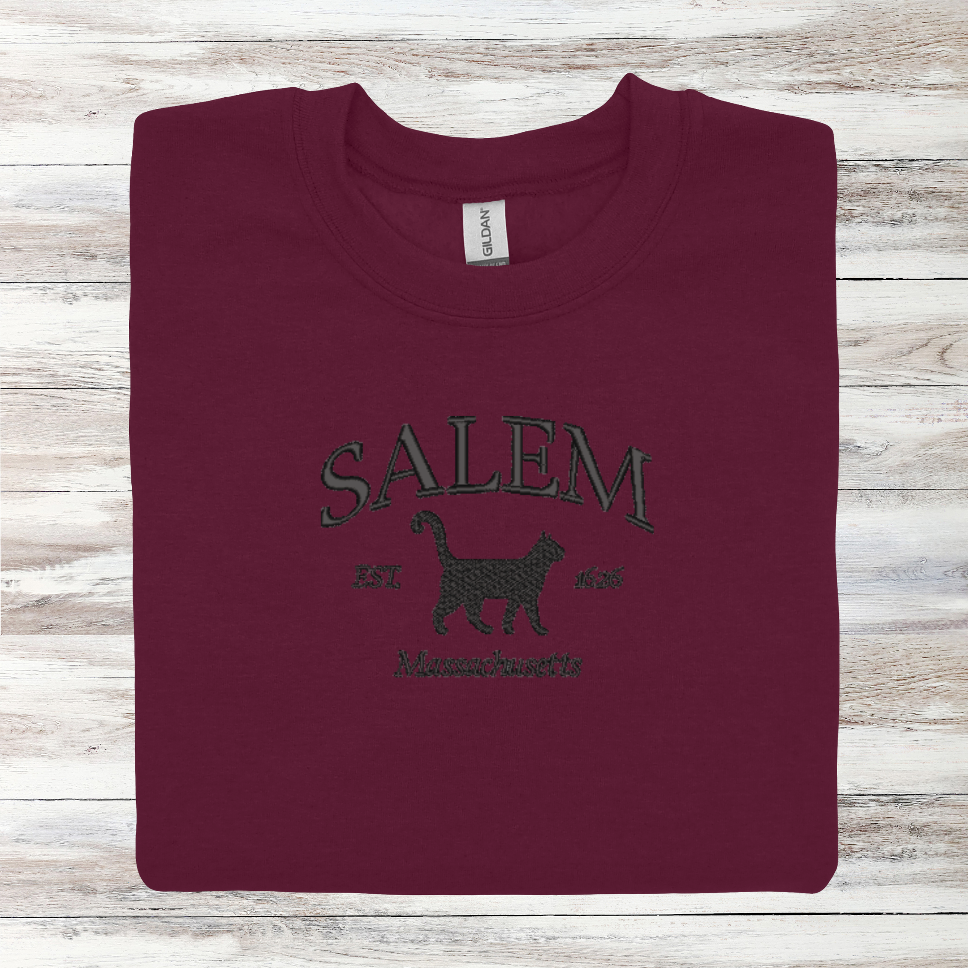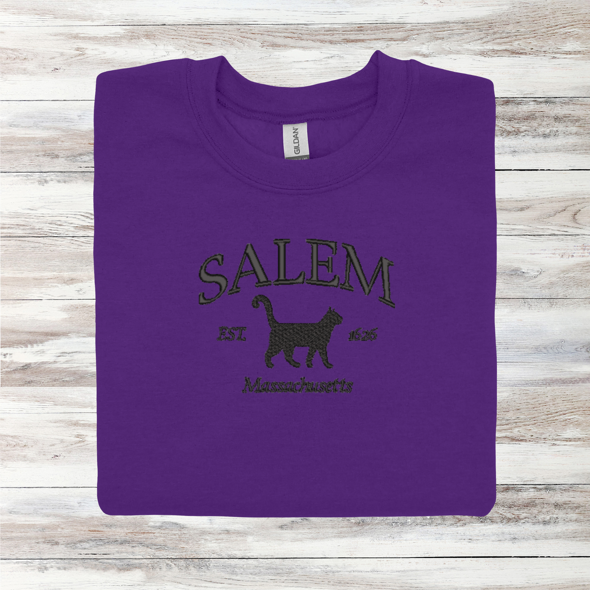 Celebrate spooky season in style with this embroidered t-shirt/crewneck. Featuring a classic black cat and "Salem, Massachusetts" design, it's the perfect blend of cozy and witchy.